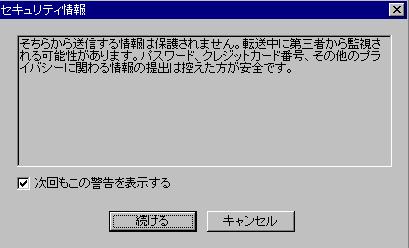 これは、送信の安全性に関して警告を発してくれているのですが、通常は気にしなくてもよいので、そのまま「続ける」を選択して下さい。