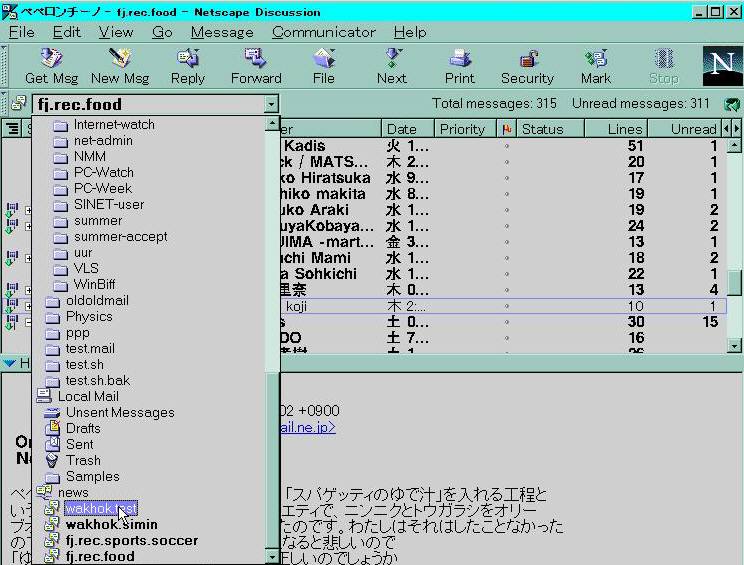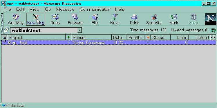 まず、ニュースグループを今見ているグループから wakhok.test に切り替えない