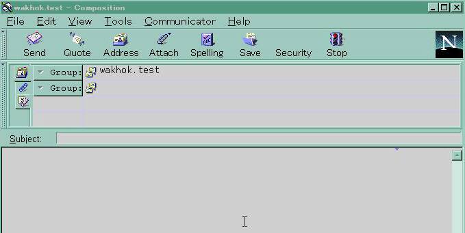 Group: 項目の少し下に、Subject: 項目があり、その右側に入力ボックスが あります。ここは、新しい記事を投稿しようとしているので、自分で記事の 題名を書かなければいけません。今の場合、練習ですので、test とでも 書いておきましょう。