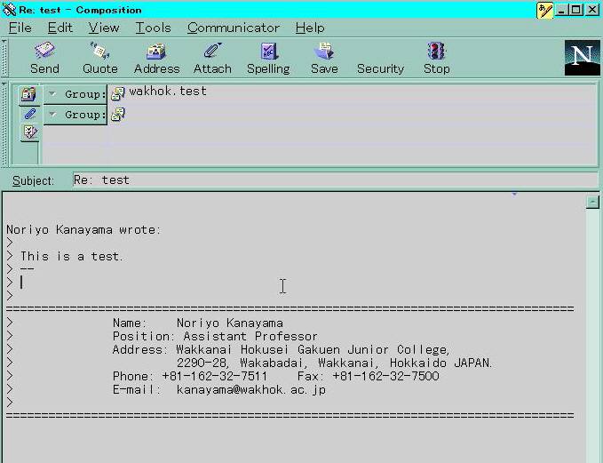 Subject: の下は、記事の本文を書く部分です。ここには自由に書いて構いません。 実際に日本中(あるいは世界中)に流れているグループに投稿する場合には、 記事の内容などはよく検討して、読んでいる人が不愉快な思いをしないように 注意しなければなりません(実際、ニュースではしばしば不適当な書き方を したためにニュース上で喧嘩になることも少なくありません)。